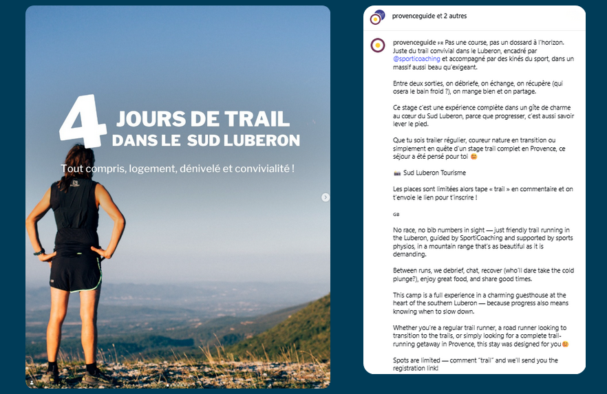 Des actions sont renforcées ou créées en partenariat avec les offices de tourisme bénéficiant de sponsorisations dédiées pour accroître la visibilité de chaque destination. Ainsi, « Le post du mois de l’OT » passe d’1 à 2 programmations mensuelles.